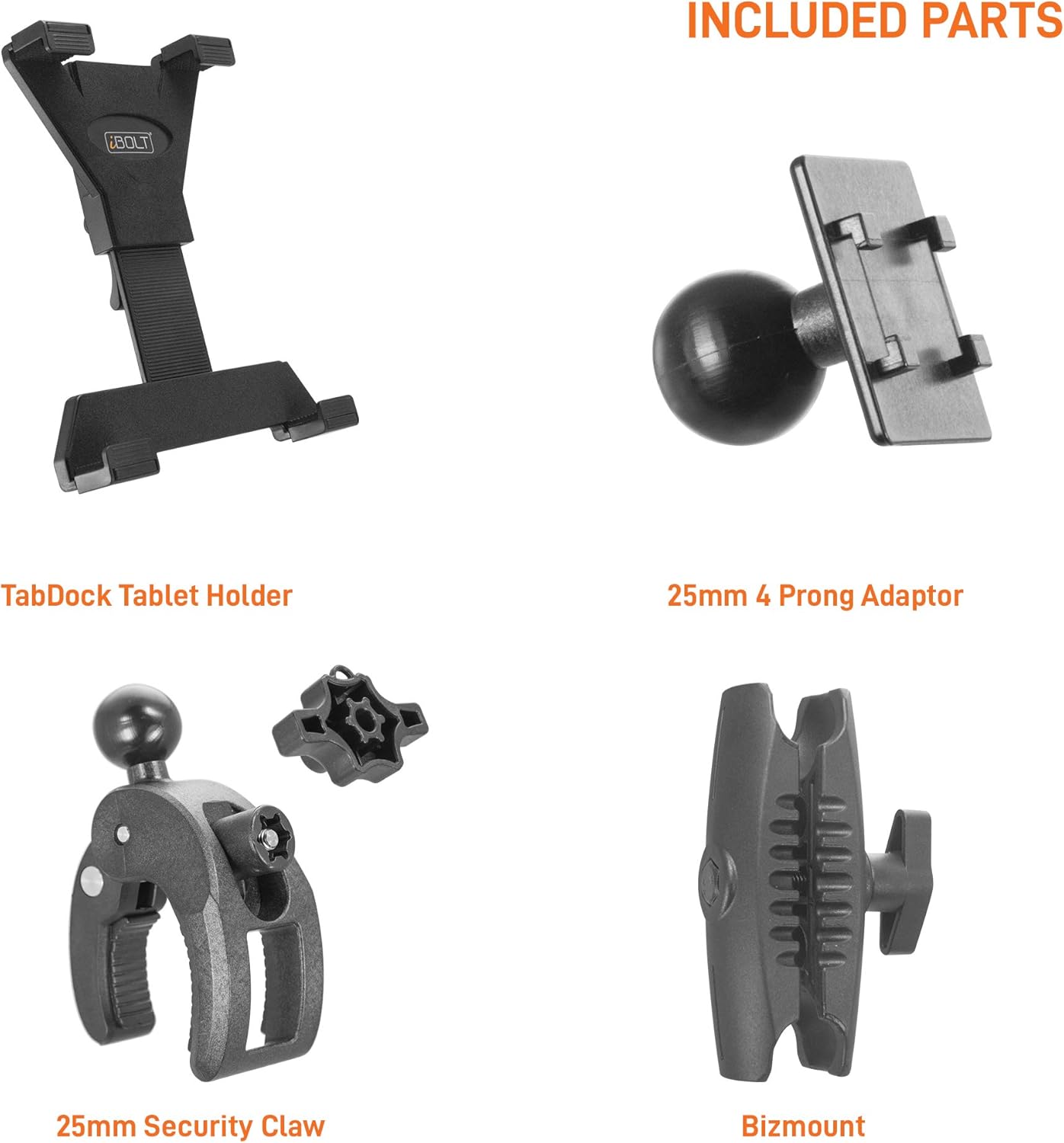 The iBOLT TabDock Bizmount Clamp comes with a comprehensive mounting kit that includes the TabDock Holder, a 4 Prong to 25mm (1-inch) ball adapter, a 3.75-inch Bizmount Arm, a 1-inch/25mm C-Clamp mount, and security hardware for the C-Clamp mount. This all-inclusive kit ensures that you have everything you need for a seamless installation. The mounts are compatible with 1-inch/25mm/B size mounts, allowing for easy customization and compatibility with other accessories.